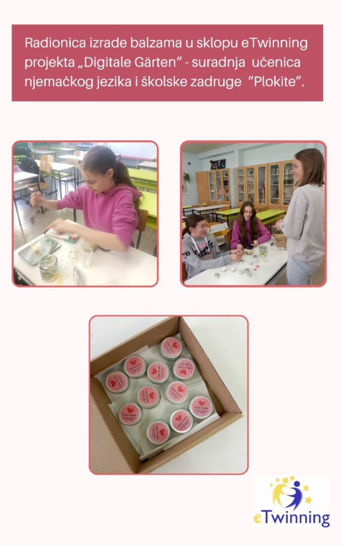 U sklopu eTwinning projekta „Digitale Gärten“ učenice 7. razreda koje pohađaju izbornu nastavu njemačkog jezika sudjelovale su u izradi prirodnog balzama za usne. Aktivnost je ostvarena u suradnji sa školskom zadrugom, čime su povezani praktičan rad, poduzetništvo i učenje stranog jezika. Učenice su balzame izrađivale od prirodnih sastojaka poput kokosovog ulja, shea maslaca, ricinusovog ulja i pčelinjeg voska. Tijekom rada razvijale su praktične vještine te koristile njemački jezik za opisivanje postupka i proizvoda. Ova aktivnost dio je projekta „Digitale Gärten“, koji potiče učenike na istraživanje prirode, održivosti i zdravih navika, uz istovremeno razvijanje jezičnih i digitalnih kompetencija.